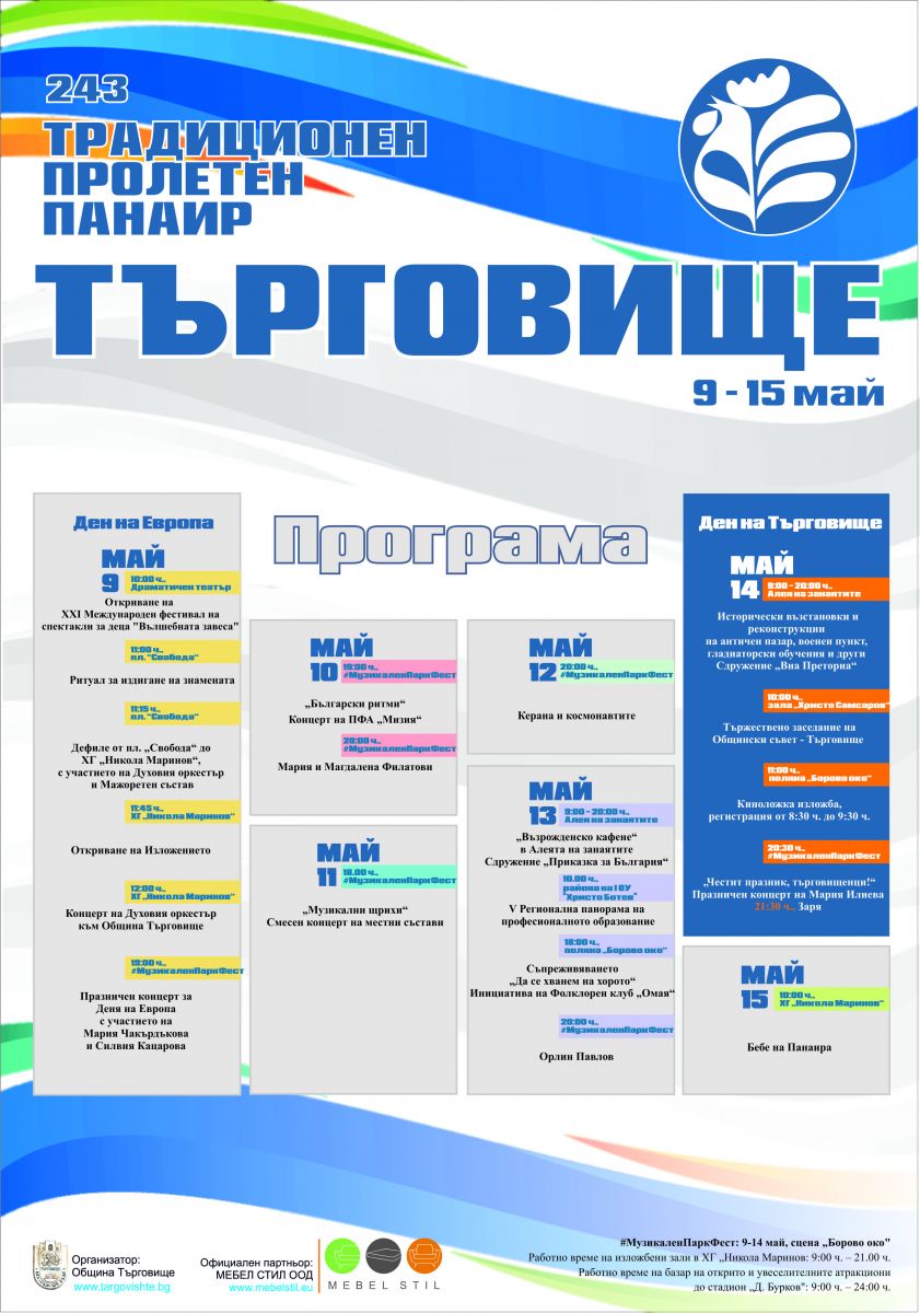 243-тото издание на Традиционния пролетен панаир в Търговище се организира със съдействието на официален партньор в лицето на фирма „Мебел Стил“ ООД. Това обяви на пресконференция днес кметът д-р Дарин Димитров. В нея участваха още прокуристът на фирмата Татяна Титкова и секретарят на Общината, Христалина Халачева.